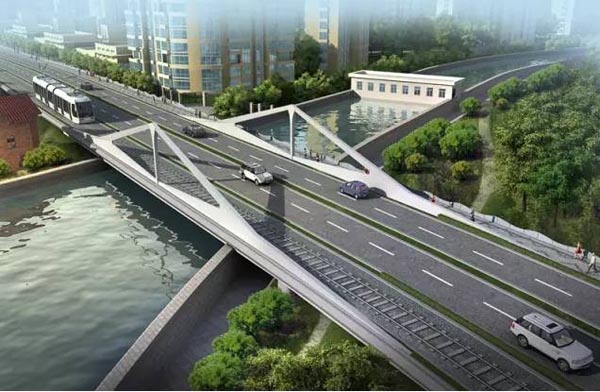 春申港桥总长190米,宽33.5米,最大跨度58米,设有双向四车道、人行道和预留有轨电车道。考虑到周边人文景观因素,尊龙凯时人生就是搏路桥集团把桥梁建造为三角形桁架结构,降低对周遭建筑的遮挡。