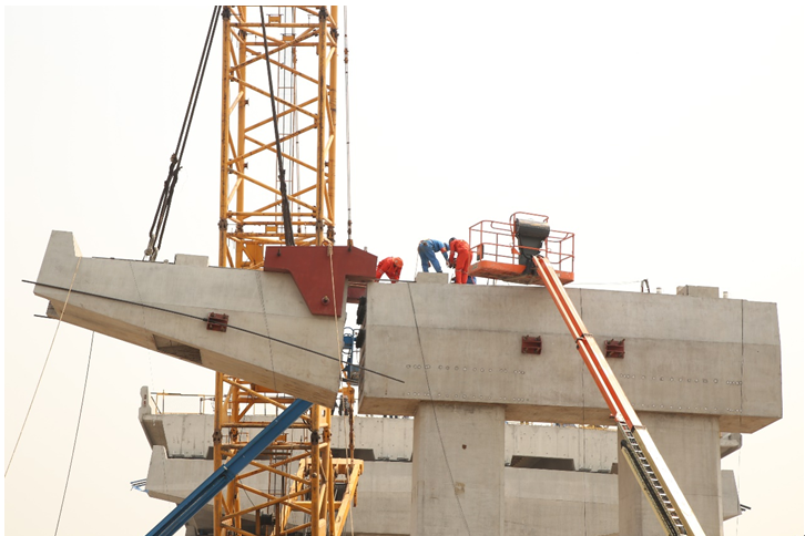解决方法:预制盖梁分段运输到现场后,吊装采用大型履带吊进行安装,首先将大重量的中间节段一次安装到位,然后进行安装两侧悬臂段盖梁。为了确保两侧悬臂段构件的安装质量和安全,我们采用定制的钢结构吊具进行安装,定制的钢结构吊具采用精轧螺纹钢锚固固定在中间节段上,可以满足施工的要求。