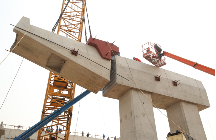 而盖梁胶接节段拼装,则不需要进行现场混凝土浇筑作业,像拼接“乐高”积木一样,直接把桥墩和盖梁“扣”在一起。施工速度远快于湿接法,且更加绿色环保。