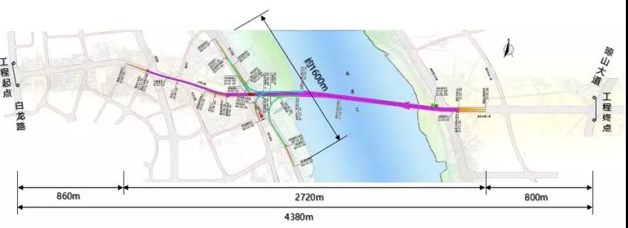 通道西起文明东路与白龙南交叉口,沿文明东路往东依次下穿滨江路、南渡江,全长4.3公里,其中隧道段全长2.7公里。隧道截面宽度28米,设双向 6 车道,设计时速主线 60公里/小时。隧道建设将大大缓解琼州大桥交通压力,提升江东区域交通能级,促进区域协调发展,增强区域的积聚辐射能力,并推动组团间的互动发展。