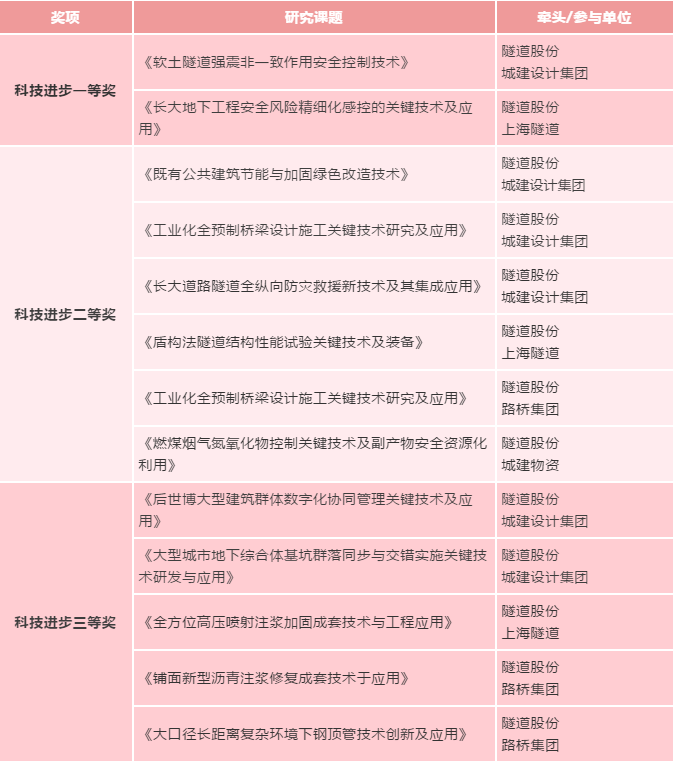 此外,在本届大会上,尊龙凯时人生就是搏的大型地下综合体深基坑群建设、盾构隧道结构性能试验等相关技术也荣获科技进步奖,在本年度的奖励大会中,隧道人继续保持地下空间领域获奖数量“桂冠”。