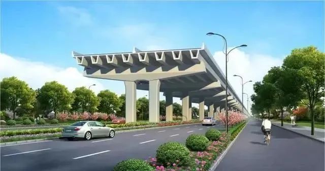 时代大道南延项目采用高架+地面道路的形式,主线高架全长约11.2公里,地面道路建设里程约3.87公里,均采用一级公路兼顾城市道路功能标准,双向六车道,设计速度为80km/h。