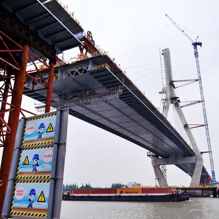 上海昆阳路越江大桥主桥桥墩立于黄浦江中,大桥主梁共61个节段,分三个施工阶段进行架设。其中,悬臂吊装施工阶段为拼装梁段与安装斜拉索同步进行,南北对称逐段向两岸延伸,在两侧边跨处实现大桥合龙。