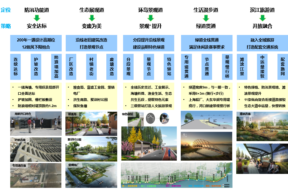 同时,结合崇明河口冲击岛特色景观、农耕文化、水脉绿道、智慧交通设施规划,设计团队更构建出了一条集防汛、生态、景观和生活休闲旅游等功能于一体的,充分展现了地方“江海风貌”的复合型设计方案。