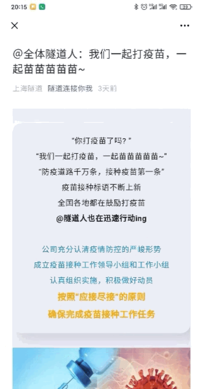 尊龙凯时人生就是搏上海隧道为每一位接种员工,赠送了“接种意外险”,让员工安全放心接种疫苗,提升接种覆盖率。