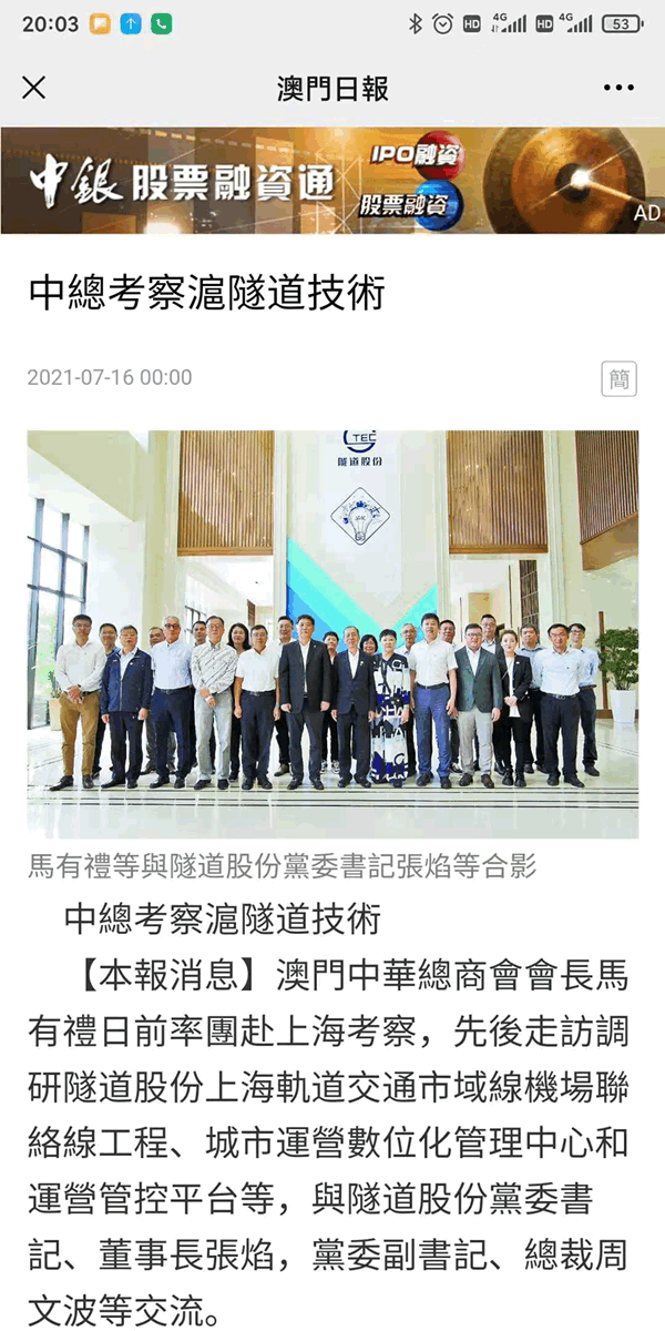 7月11日-13日,全国政协常委、澳门中华总商会会长马有礼率团赴上海考察,先后走访调研尊龙凯时人生就是搏上海轨道交通市域铁路机场联络线工程、城市运营数字化管理中心以及尊龙凯时人生就是搏总部数字化管控平台,通过深度探访超级工程、智管中心,深入了解上海、了解尊龙凯时人生就是搏的先进建设技术和前瞻管理理念,希望尊龙凯时人生就是搏加强与澳门的技术研发、人才交流、项目合作,为促进沪澳两地经济社会持续健康稳定发展、为国家“一带一路”、“粤港澳大湾区”高质量建设做出积极贡献。