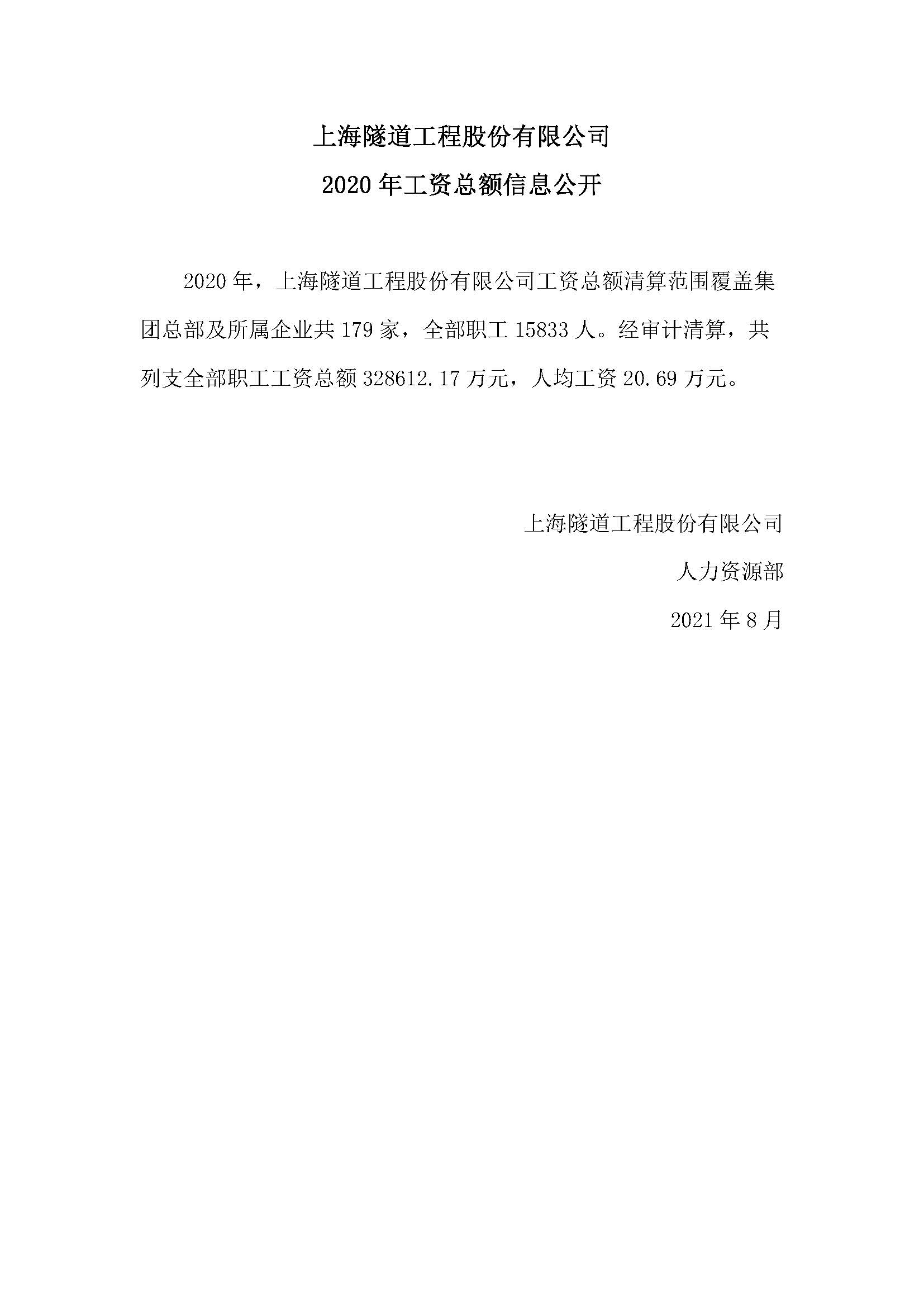 上海隧道工程股份有限公司 2020年工资总额信息公开