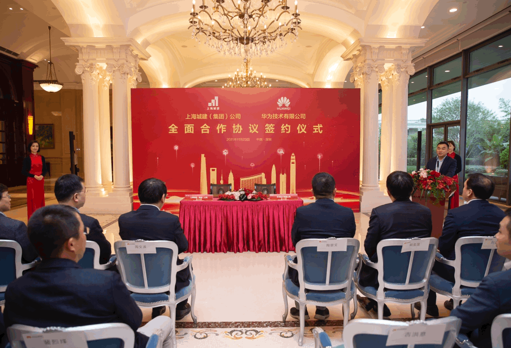 上海城建集团党委副书记、总裁周文波,华为公司董事、高级副总裁、首席信息官陶景文等领导出席签约仪式,并见证双方代表签署全面合作协议。
