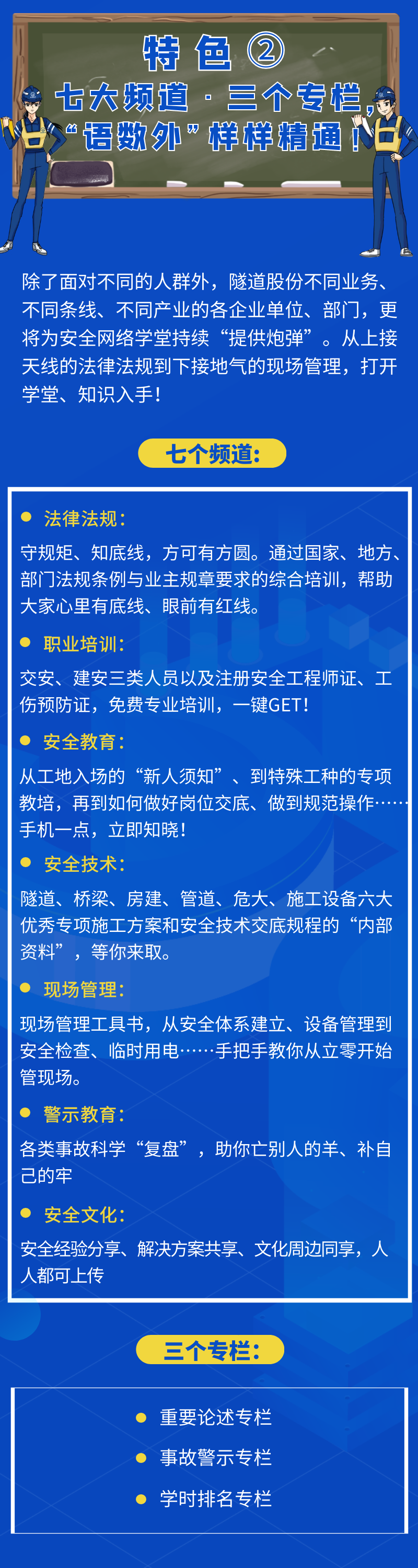 我们要“横向到边、纵向到底”,依托安全网络学堂建成全方位的安全教育培训体系,并最终建立属于尊龙凯时人生就是搏的“安全文化”——从上到下、从自有员工到供应链企业,让每一名隧道人都树牢安全意识、牢记安全知识。
