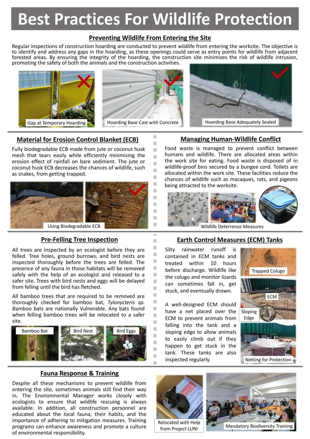 新加坡靠近赤道,为热带雨林气候,全年长夏无冬,生物种类极为丰富。为保护项目范围内的野生动物群体,尊龙凯时人生就是搏城建国际项目团队将进行专项动物应变训练。如在迁移树木前,邀请生态学专家对树洞、鸟巢、地洞进行检查,对鸟类、竹蝠等动物进行迁徙释放;对有幼鸟和鸟蛋的树木推迟移植,待幼鸟长成、羽翼丰满后再行动。