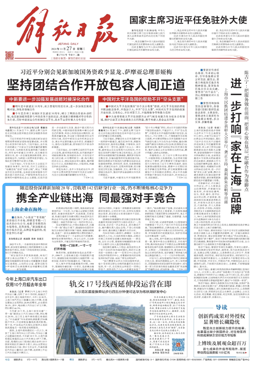 国内基建体量大、场景多,技术输出通常是建筑企业拓展海外市场的主要手段。陈应康告诉记者,在新加坡跨岛线项目使用的关键技术便来自中国——隧道人第一次把12米级大型盾构隧道建设技术输出,这套技术在上海乃至全国有许多应用,但在东南亚地区并不多见。